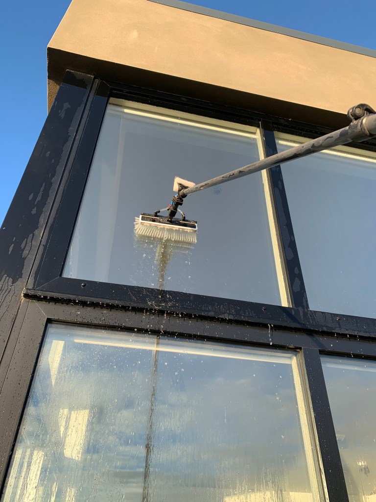We use the reach and wash system to clean Windows from the outside at ground level. This usually eliminates the need for ladders reducing potential safety risks. Using an extendable water-fed pole we wash the windows with a brush and rinse with especially purified water that we will bring along. The water will dry off without spots as there are no impurities left in it.